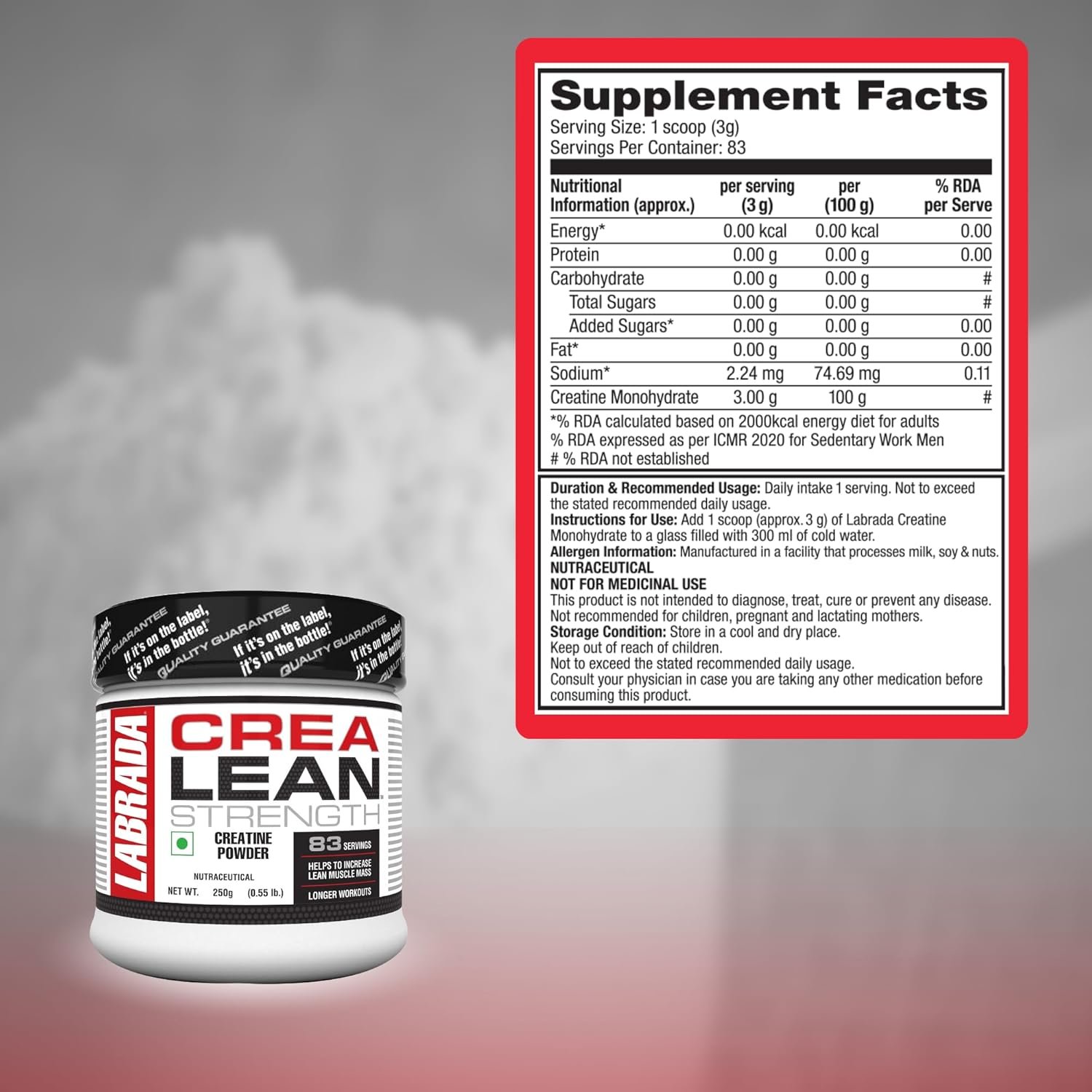 Labrada, a globally recognized name in sports nutrition, ensures the highest quality standards with its Crea Lean formula, giving you pure creatine monohydrate that is fast-absorbing, effective, and safe. Whether you are lifting weights, training for endurance, or looking to improve recovery, this supplement is made to support your goals.